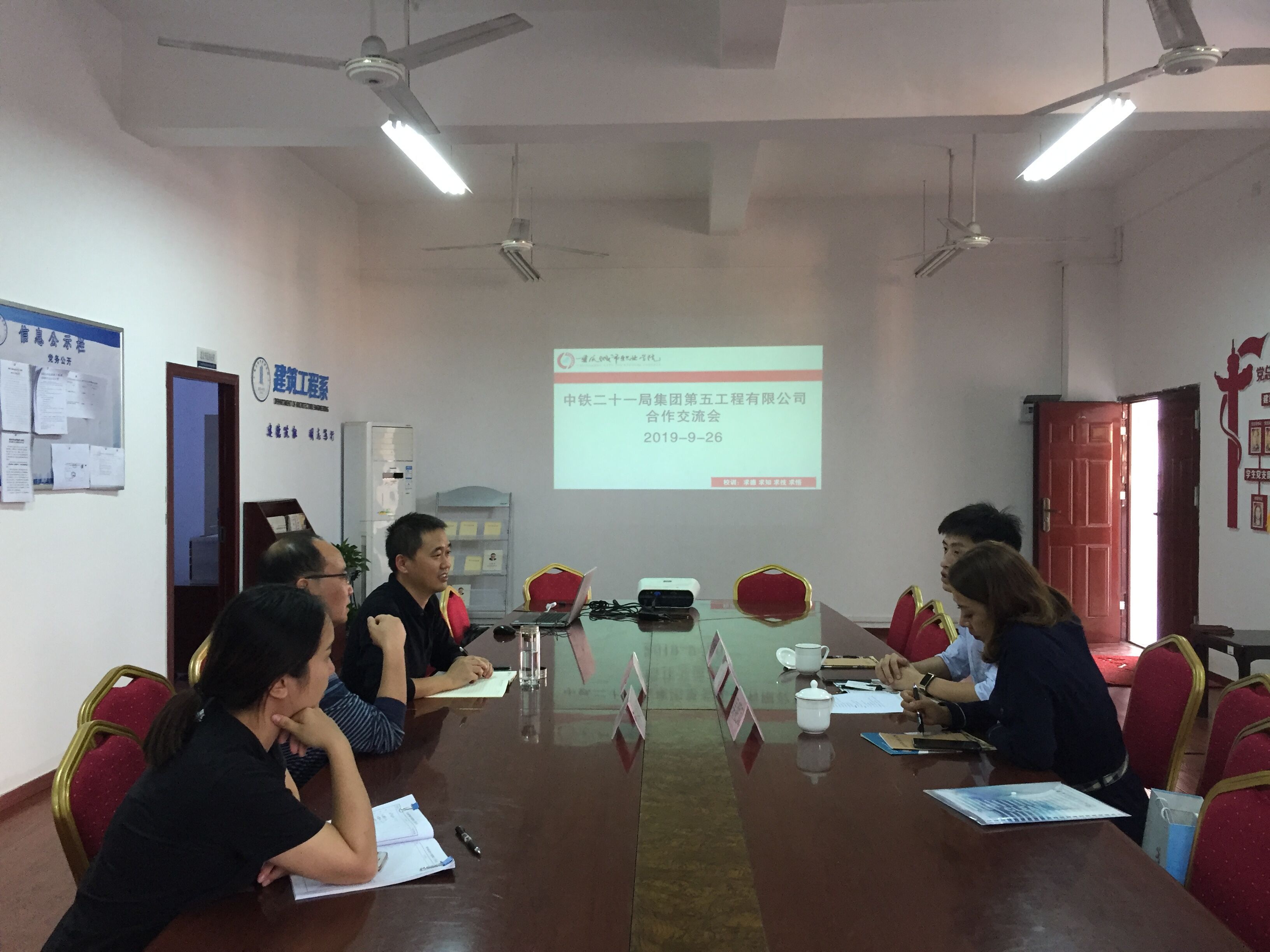 2019年9月26日,中铁二十一局集团第五工程有限公司人力资源部部长付鹏,欣安怡人力资源管理有限公司总经理吴明凤,李金宇一行3人到建筑工程系就2020届毕业生实习就业等相关事项进行合作交流。建筑工程系党总支书记何春华、系主任韩永光、就业干事鲁庭利陪同参加。