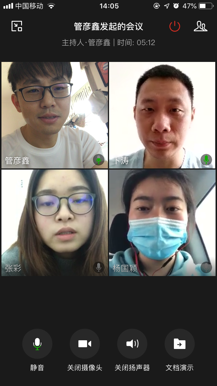 2020年4月14日下午,“3+1+N”管彦鑫团队例行召开了线上工作会议,主要总结了团队成员在近期完成的工作成果,并对下一步公司产品、员工职业技能大赛及员工就业工作进行研究和探讨。