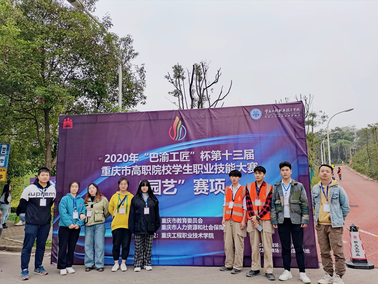 由重庆市教委和重庆人力资源和社会保障局举办的第十三届巴渝工匠杯重庆高职院校员工技能竞赛“园艺”赛项于10月28-30日在江津区重庆工程职业技术公司举行。由我系教师刘晓晓、叶昌带队,园林工程技术专业员工唐萍、陈秋月、梅文俊、倪泽东、熊亚、付中倩几位同学组成的参赛队伍在竞赛中奋勇拼搏,通过三天的比赛角逐,最终获得三等奖。